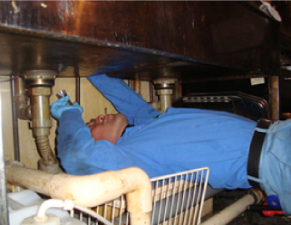 厨房内の流し台やシンク、オーブンの裏側にゴキブリが巣を作っています。ここに潜り込んで専用の道具で、FCCコーキング材を施工します。