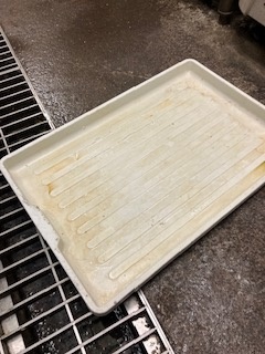 ショーケース下ドレン水受け 施工員ブログ 2025.03.25 和食料理店の現場です。飲料用のショーケース周辺にゴキブリの生息が見られました。熱源も巣になり易い箇所ですが、どちらかというとドレンの水が溜まるトレーが下部にあり、こちらが最も危険な箇所です。トレーを引き出してみると、ご覧の様に裏側に溝があり、この隙間がゴキブリの巣になり易い箇所です。 FCCでは細部の巣になり易い箇所に薬剤を施工して駆除効果を高めてゴキブリゼロを目指しております。