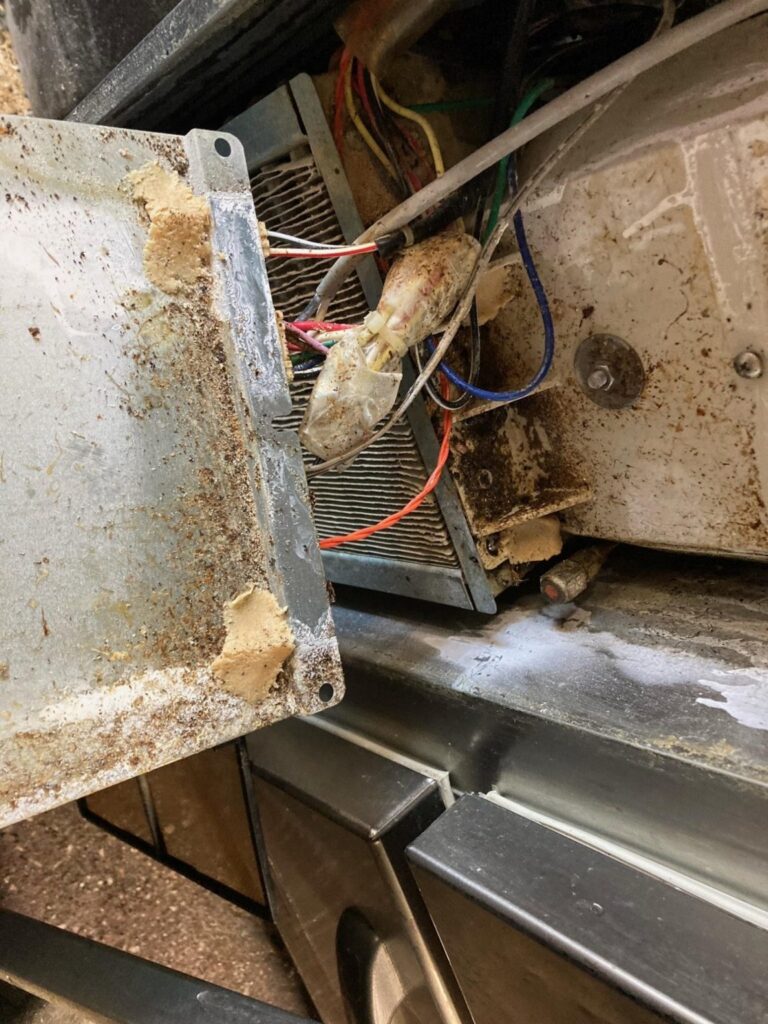 コールドテーブルのモーター内の基盤を外してみたところ裏は糞だらけで、
