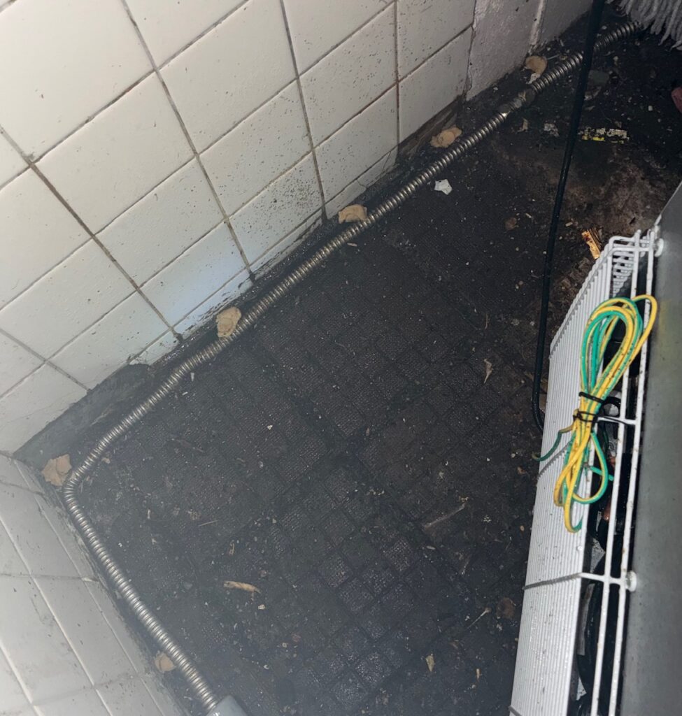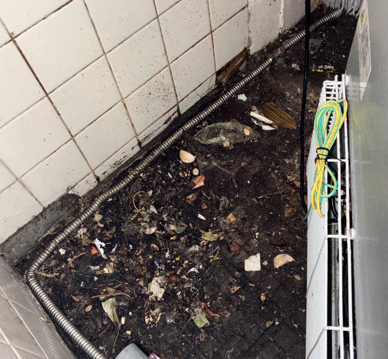 冷蔵庫を動かして確認したところ、下部にゴミが溜まっており、