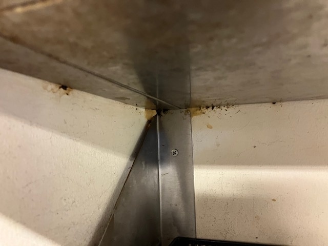 棚と壁の隙間に糞が見られます。そしてよく見ると…、その隙間から触角が。