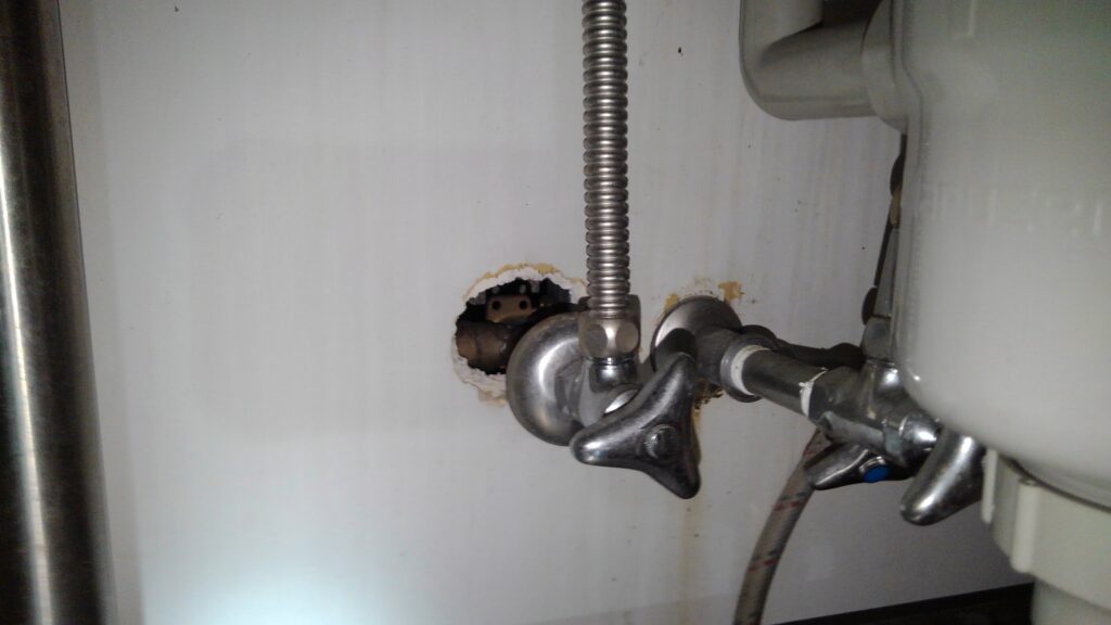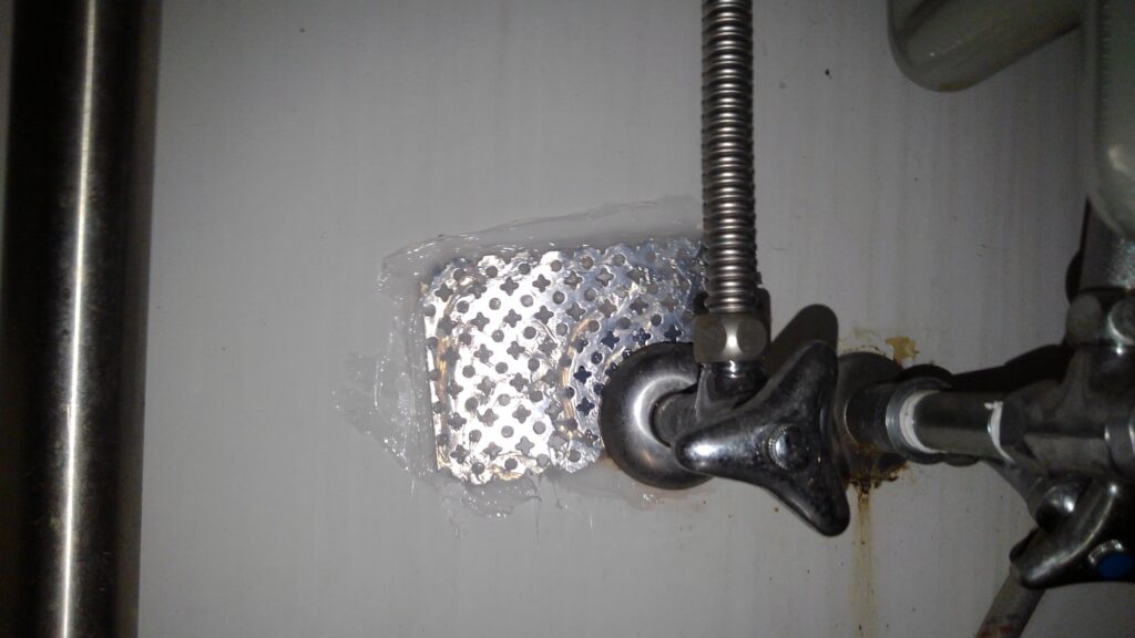 店内流し台裏壁面にあるパイプ回りをかじられて穴を広げられたものになります。