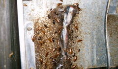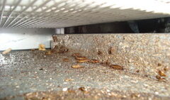 今回は湘南の浜辺にあるカフェに施工でお邪魔しました。大きく広い店舗で厨房も広く余裕がある造りで什器下にもあまりゴミが溜まっておらず、非常にきれいでした。一見ゴキブリの生息はなさそうでしたが、熱源に生息がありました。画像は洗浄機のカバー部分で...
