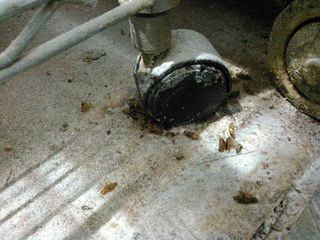 長らく動かしていない棚脚のキャスターにビッチリ隠れていました。