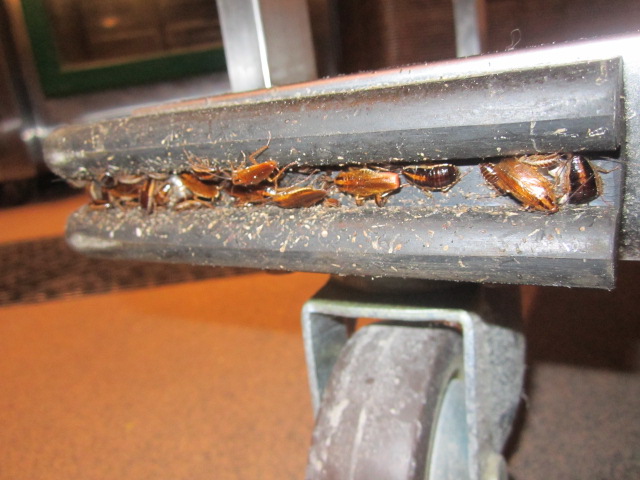 画像はパン屋さん等にあるパンを鉄板トレーごと運ぶ配線台の一番下の棚の角をカバーしているゴムの溝に生息がありました。