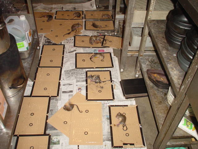 今度は2匹かかっています。これではキリがないので手早く店内の残りの部分を設置しました。粘着マットの設置はスピード勝負です。ネズミが警戒する前に手早く設置して消灯した方が数多く捕獲出来ます。翌日、別のスタッフがマットの回収に行くと11匹の捕獲がありました。(写真)