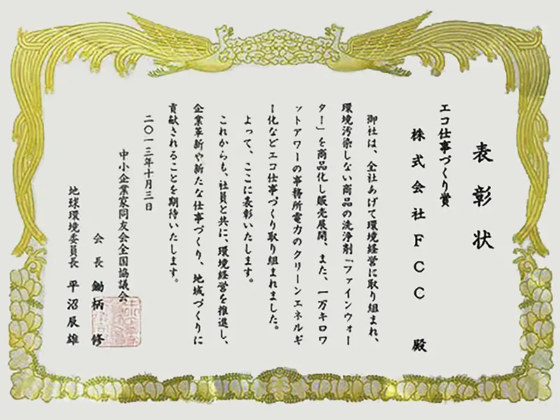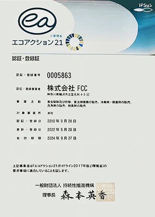 | 事業目的 | 1.環境衛生のコンサルタントとして、技術・商品・サービスの高い質を追求し、 社会に提供します。 2.福祉の担い手として、自主的に経営基盤の強化を図り、高い質のサービスを 社会に提供します。 3.企業努力を怠らず、生産性の高い経営で適正利益を確保し、社員・社内・社会に 還元します。 ※以上を実践し、社会から必要とされる企業FCCのプラス連鎖を各地に広める事を 使命とします。 |