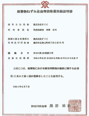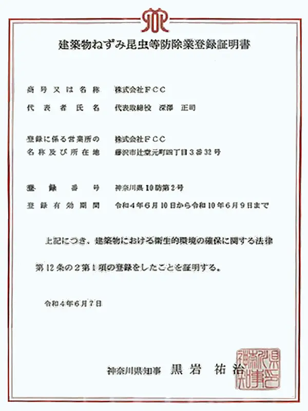 | 登録 | 防除業登録 神奈川県10防第2号・防除作業監督者(深澤正司)防再12141号 |