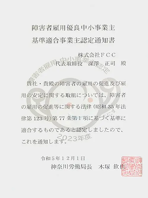 障害者雇用に関する優良な中小事業主に対する認定制度(もにす認定制度)にて認証を受けました。