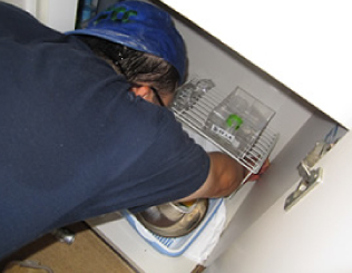 冷蔵庫のモーターは温かく巣になりやすい箇所です。冷蔵庫を移動させて、モーター内部に直接施工します。