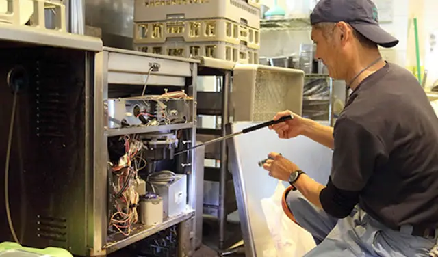 ゴキブリの巣を捜します。ゴキブリは人の目につかないコールドテーブルの天板の裏、機械装置のモーター部分、配電盤の中、冷蔵庫扉パッキンの間、洗浄器、什器の裏等に巣を作って生息していきます。この巣を確実に発見し、きれいにゴキブリの卵や糞を除去します。